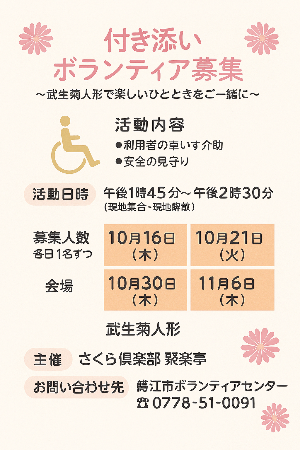 『さくら倶楽部聚楽亭』が下記の日程で施設利用者の方と外出するため、その際の付き添いボランティアを募集しています。